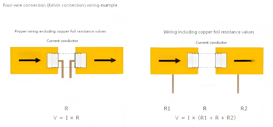 Four-terminal (Kelvin) connection separates current-carrying paths from voltage-sensing paths