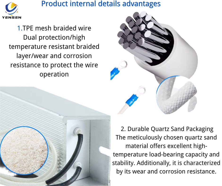 The trapezoidal aluminum housing increases surface area compared with rectangular designs, improving airflow. Braided, flame-retardant leads ensure thermal reliability. Heat dissipation efficiency is typically 20–30% higher than standard rectangular aluminum-cased resistors.
